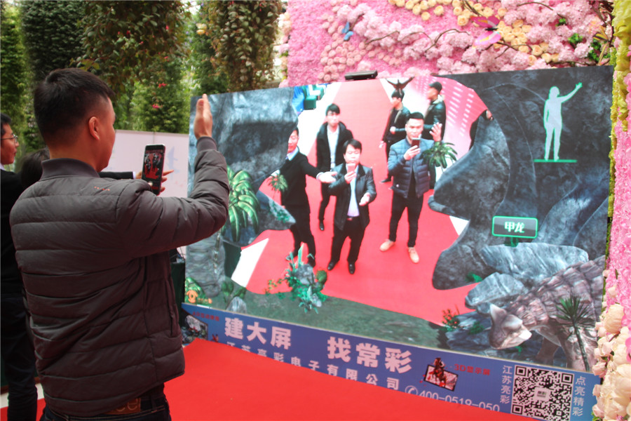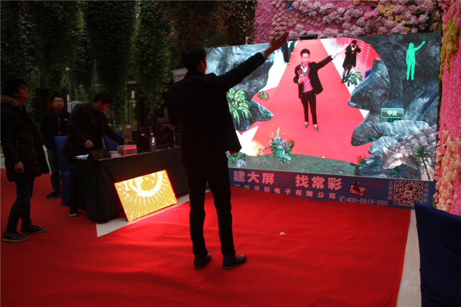 At the entrance of the conference hall, Jiangsu bright color electronic display of the hottest LED+3D+AR technology, through the big screen and human interaction, many participants in the side of the crowd, also want to experience a.