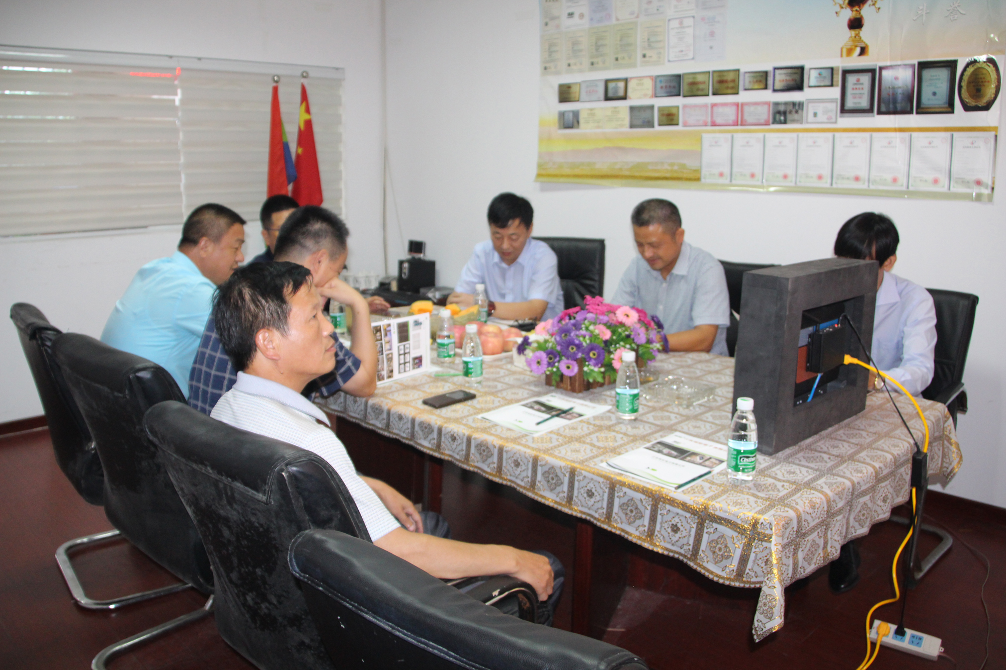 first general manager Mr. Zhang Jiuyu on the situation and development planning of Jiangsu Liangcai company to leaders is introduced, and explained several kinds of the most popular series of products include: power supply mobile power supply series (sliding contact line), fixed power supply series (busbar), LED+ graphene +AR/VR+3D+ transparent glass screen, glass screen / grille screen, screen, screen, soft floor tile spherical screen and LED display principle, advanced technology, product promotion status and market prospect at home and abroad.
