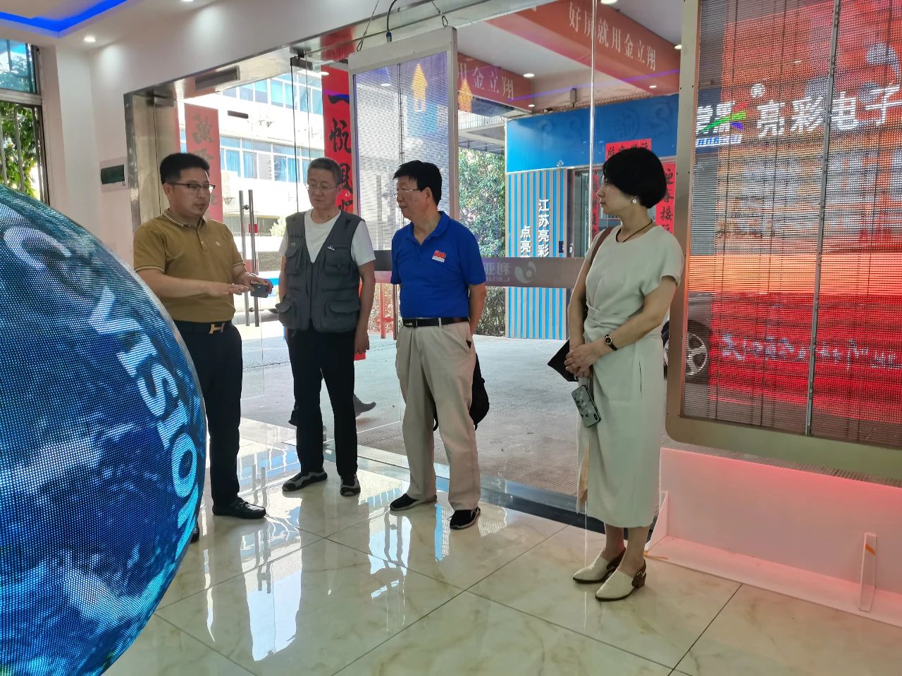 步入展廳,章總向各位領導介紹了LED顯示特色產品,如135寸會議一體機、球形屏、地磚互動屏、3D屏等,包含多類不同的應用場景。