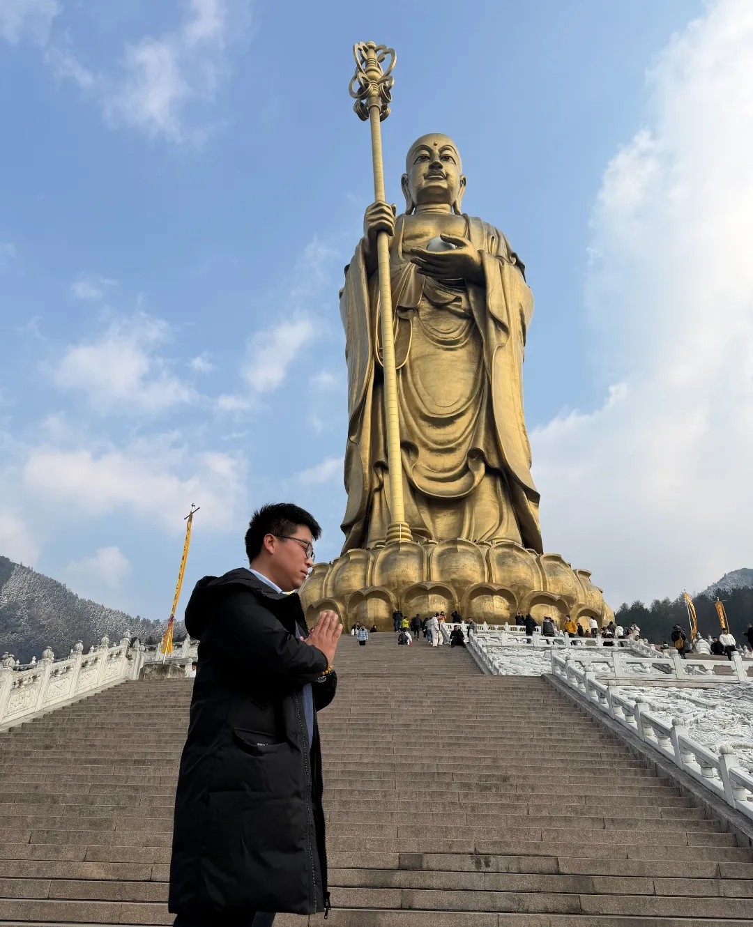 我們第一站就打卡了九華山大愿文化園。一踏進(jìn)園區(qū),莊嚴(yán)又治愈的氛圍瞬間包裹全身,巨大的地藏菩薩圣像穩(wěn)穩(wěn)矗立在暖陽(yáng)里,讓人忍不住放慢腳步。